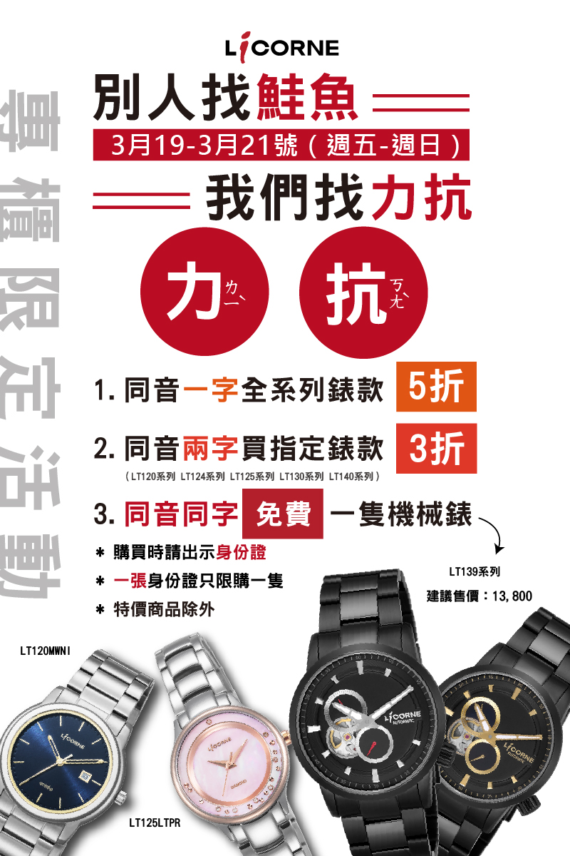♡♡ 來翡仕有情人【鐘】成眷屬 情人節愛你1314一生一世 活動期間:2/1~2/14 至全台翡仕鐘錶門市 購買LiCORNE力抗錶鈦合金系列 雙雙成對♡ 單支也有優惠