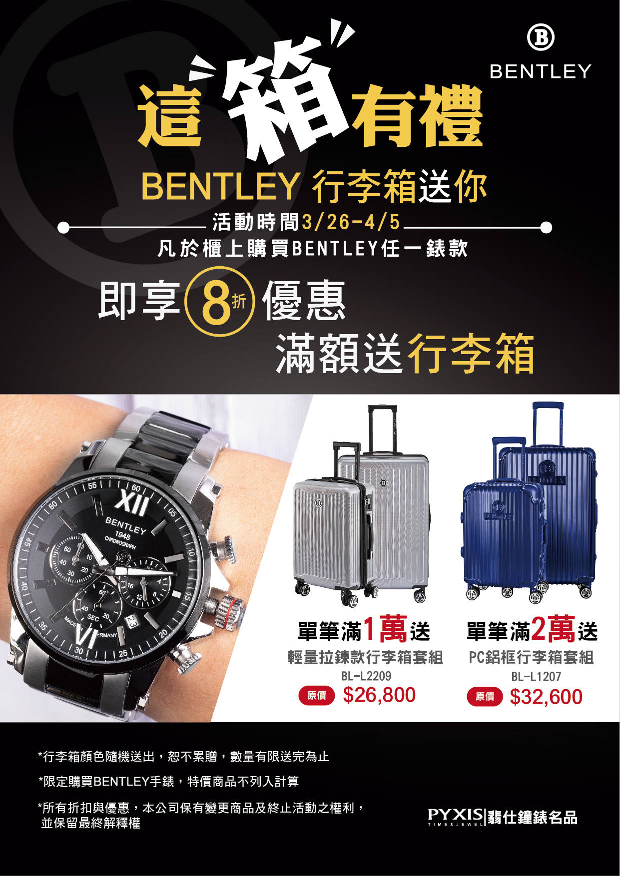 這⚡箱⚡有禮BENTLEY行李箱送你!購買BENTLEY任一手錶,即享8折優惠,滿額送行李箱➡➡滿一萬送輕量拉鏈行李套組BL-2209(原價26800)➡➡滿兩萬送PC行李箱套組BL-1207(原價32600)➡3月26號(星期五)-4月5號(星期一)➡全台翡仕專櫃(卡西歐專櫃除外):https://reurl.cc/Q7Nl95